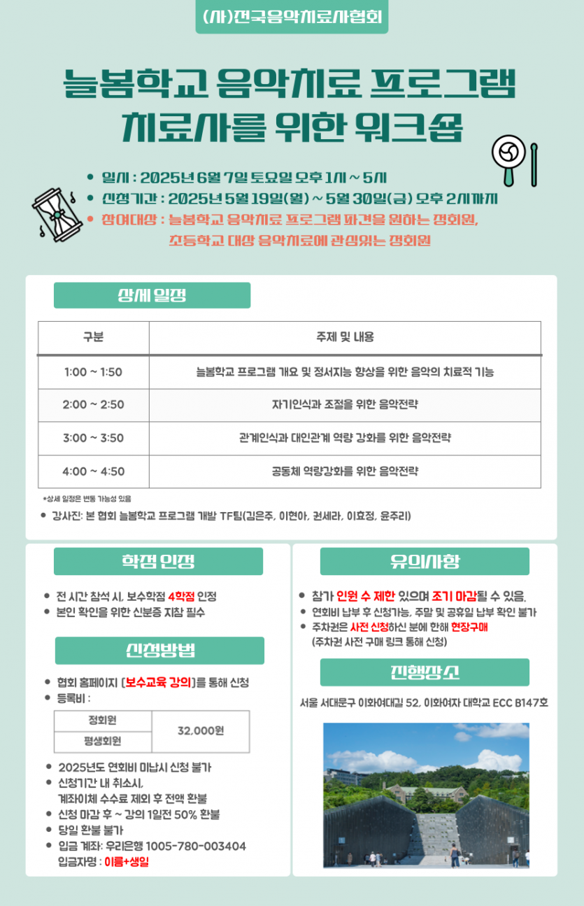 이에 따라, 늘봄학교 음악치료 프로그램의 치료사로 활동을 희망하시는 정회원께서는 아래 링크를 통해 2025년 5월 30일(금) 오후 2시까지 신청해 주시기 바랍니다.