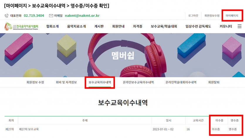 보수교육 이수증/영수증 확인 방법 작성자 관리자 조회 661회 작성일 23-07-12 15:35 본문 안녕하세요 전국음악치료사협회입니다.협회 교육 이수증/영수증 확인 방법 안내 드립니다.아래 예시와 같이 협회 홈페이지 우측상단 마이페이지에서 확인 가능하니 참고 바랍니다.추가 문의사항 있으시면 협회로 연락 주시기 바랍니다.감사합니다. 목록 이전글한국발달재활사협회 회원가입 안내 23.07.28 다음글제17회 세계음악치료학술대회 대면/비대면 참여 안내 23.07.11